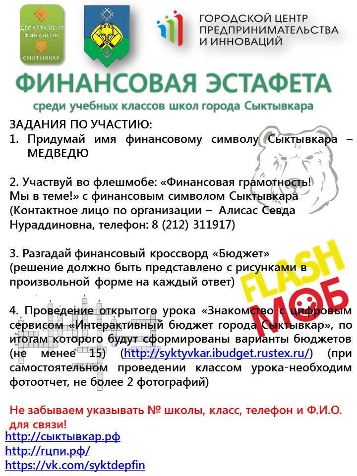 В рамках всероссийской акции «Дни финансовой грамотности в учебных заведениях» администрацией города проводится «Финансовая эстафета среди классов образовательных учреждений города. Прими участие! Будь финансово грамотным! Будь в теме!