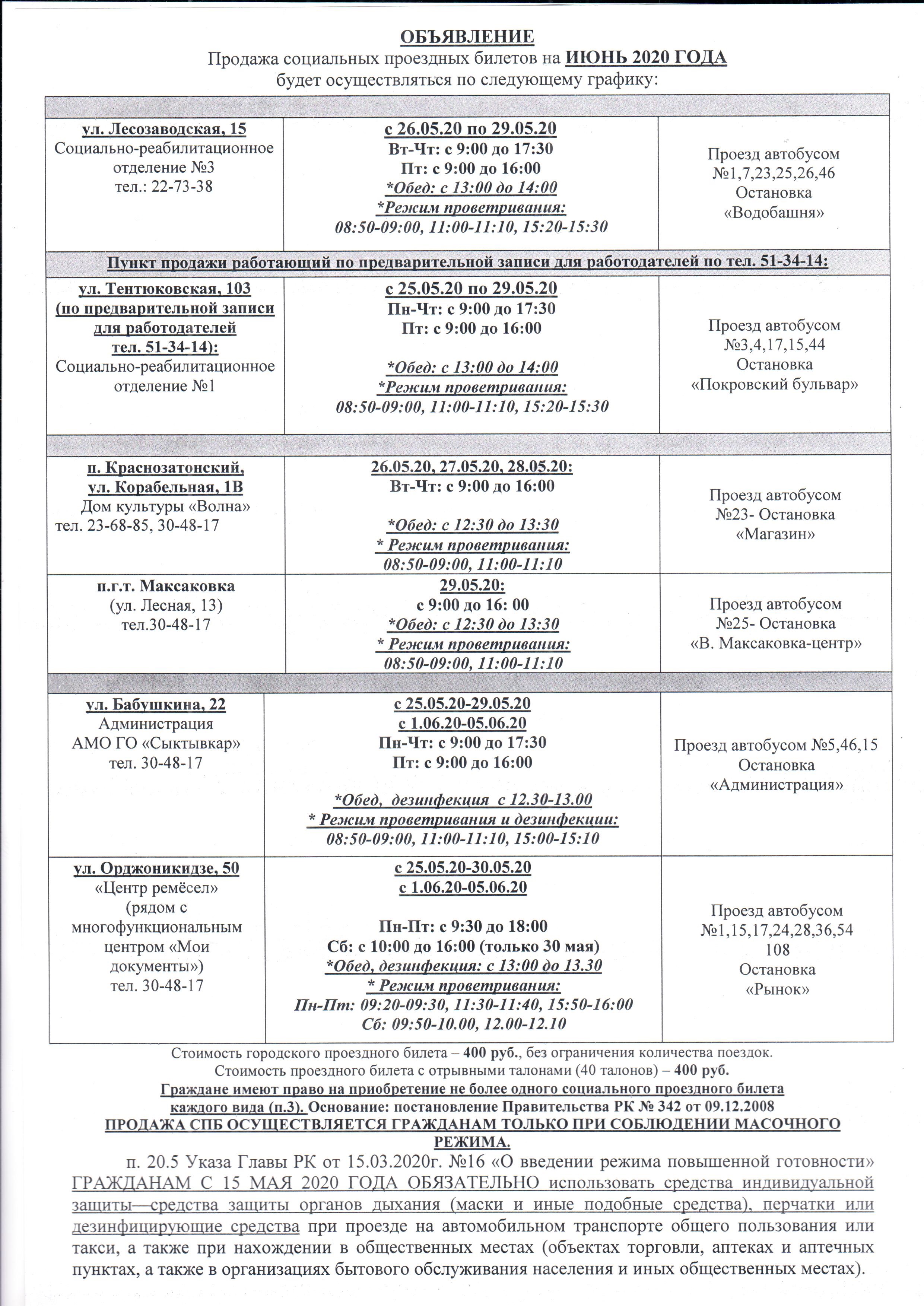 ГБУ РК «Центр по предоставлению государственных услуг в сфере социальной защиты населения города Сыктывкара» сообщает на своём сайте, что с 25 мая открываются пункты продажи социальных проездных билетов для жителей Сыктывкара, имеющих право на их получение при условии соблюдения масочного режима и социальной дистанции.